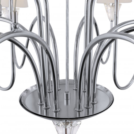 Массивный декор стеклянных граней выделяет светильники этой серии среди других моделей. Хромированную металлическую арматуру мягко оттеняют белые хлопковые абажуры. Рассеивая свет, они дарят уютное, атмосферное освещение. Классическая грациозность светильников выражена в элегантных изгибах рожков и подчеркнутой гармонии оттенков. Серия включает регулируемую по высоте подвесную люстру на 12 и 9 плафонов, две настольные лампы, а также бра на один и три плафона.