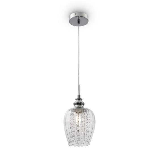 Небольшие светильники с характерными чертами в конструкции станут изюминкой любого интерьера. Изысканная форма стеклянных плафонов сочетается с элегантными подвесками из кристаллов. Свет, отражаясь от тонированной поверхности стеклянной сферы, переливается и играет на их гранях. Арматура сделана из хромированного металла. Высоту подвесных светильников можно отрегулировать длиной шнура.