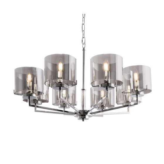 Серия Karen из хромированного метала и стекла выполнена в стиле минимализм. Стеклянные дымчатые плафоны дополнены гальваническим напылением, которое придает стеклу зеркальный эффект при выключенном освещении и делает его ярким и сияющим при включенном режиме. Плафоны имеют форму цилиндра и не закрыты сверху и снизу, что позволяет избежать скопления пыли. Плафоны крепятся на скобы, что позволяет быстро и легко их снимать и одевать. Высота люстры регулируется длиной цепи.