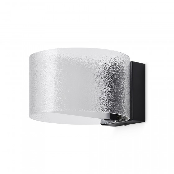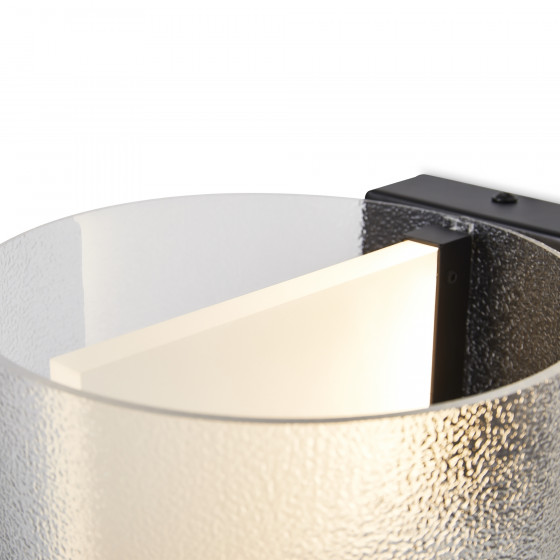 Материал арматуры — металл, цвет — черный. Потолочный, настенный и подвесной светильники оснащены LED-источниками света. Цветовая температура 3000К. Прозрачный рельефный плафон «парящий в воздухе» с эффектом замороженного стекла. Подходит для интерьеров в стиле минимализм и лайт лофт.