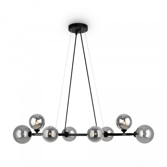 Выдержанная геометрия в сочетании с эргономичным минималистичным исполнением – универсальный и востребованный дуэт. Графичный вытянутый силуэт серии станет эффектным акцентным элементом и обеспечит яркое и равномерное освещение большой площади. Металлическая арматура светильника представлена в черном и золотистом оттенках. Плафоны-сферы, выполненные из стекла, также имеют два цветовых решения: полупрозрачный дымчатый и матовый белый. Тонкие тросы и отсутствие центрального стержня создают визуально легкий, невесомый облик. Вытянутая арматура будет выгодно смотреться над обеденным столом, в интерьере гостиной или кабинета. Культовые формы актуальны для современных лофтовых и минималистичных пространств, интерьеров в стиле сканди, mid-century modern, хай-тек, контемпорари.