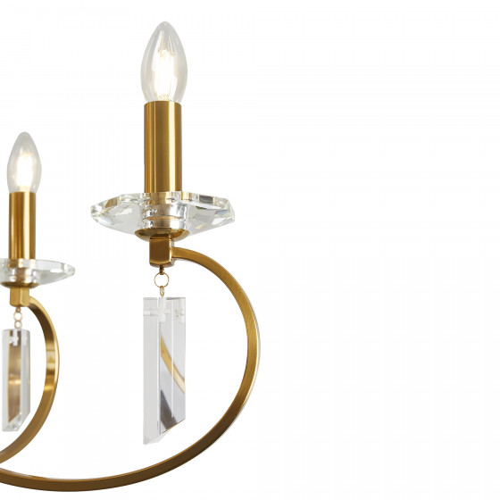 Материал арматуры — металл, цвет — никель или латунь. Подвесные светильники с цоколем E14. Доступны с пятью или шестью источниками света. Грани хрустальных подвесов создают эффект перелива радуги. Центральный декор из стеклянных трубок. Подходит для классических интерьеров.