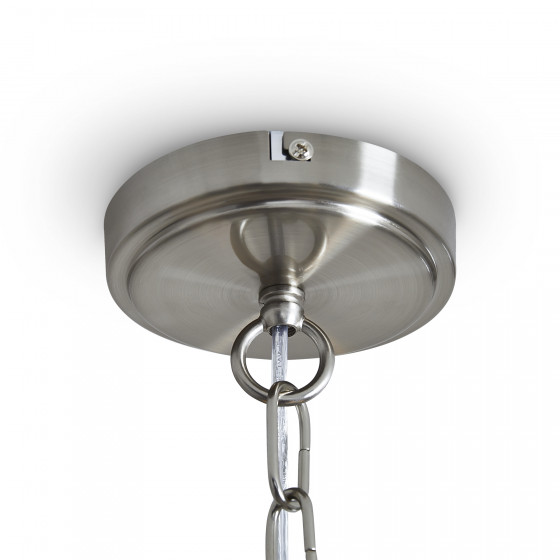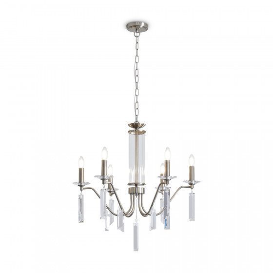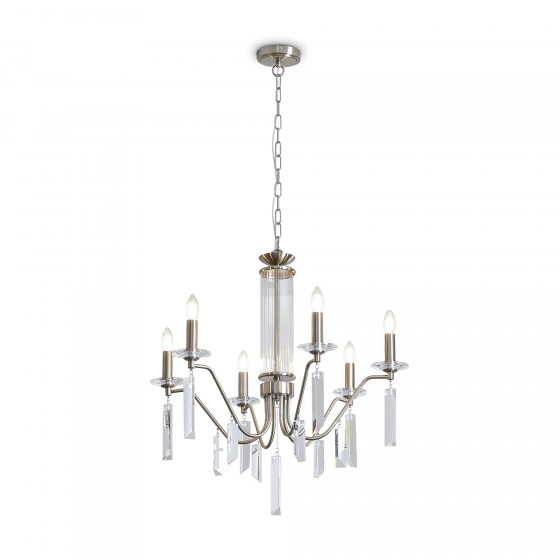Материал арматуры — металл, цвет — никель или латунь. Подвесные светильники с цоколем E14. Доступны с пятью или шестью источниками света. Грани хрустальных подвесов создают эффект перелива радуги. Центральный декор из стеклянных трубок. Подходит для классических интерьеров.
