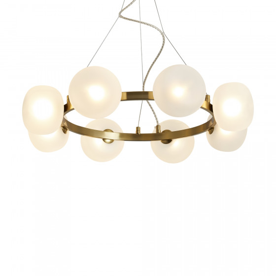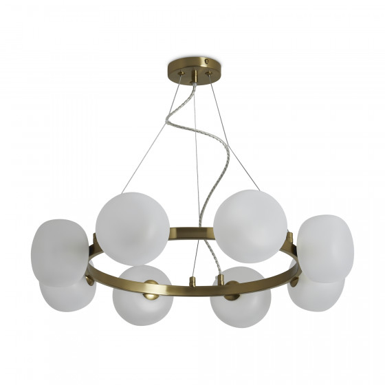 Арматура - металл. Цвет арматуры - латунь. Серия с необычной формой плафонов — немного приплюснутые, матовые белые. Настольные лампы и настенные бра выгнутой формы. Источник света лампа. Цоколь G9.