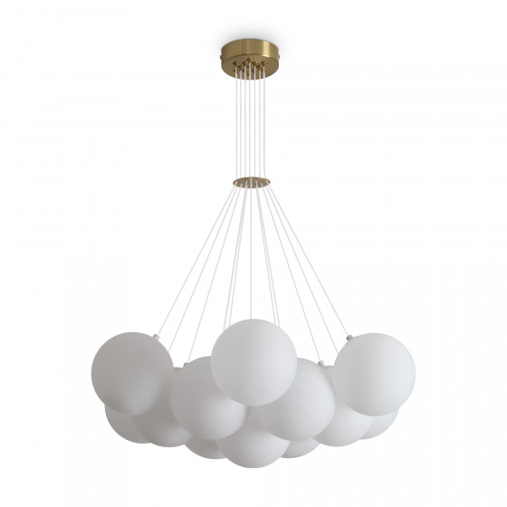 Материал арматуры – металл, оттенки – хром и латунь. Плафоны-сферы из белого матового стекла. Подвесы двух видов. С регулируемой высотой на 7, 13 и 19 ламп с цоколем E27 помещены внутри плафонов на прозрачных проводах. А подвесы с фиксированной высотой на 6 ламп с цоколем Е14 незаметно расположены над декоративным "облаком" плафонов.