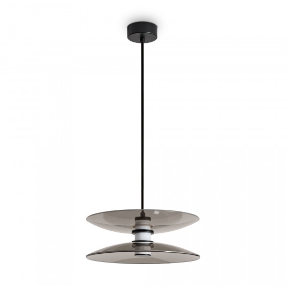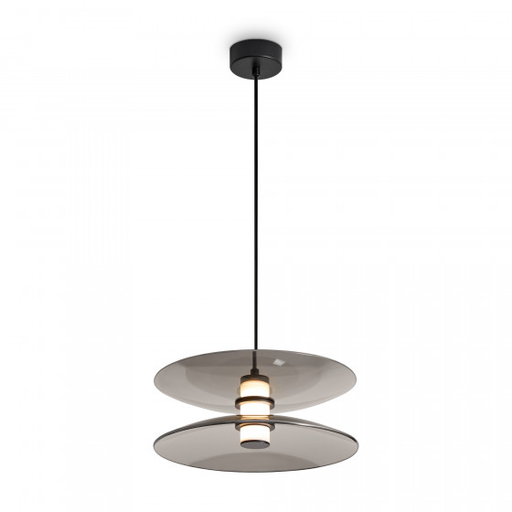 Материал арматуры — металл, цвет — черный. Плафоны выполнены из стекла дымчатого цвета. Светильники представлены в подвесном и напольном исполнении и оснащены LED-источником света с цветовой температурой 3000К. Сочетание металла и затемненного стекла создает выразительную атмосферу в современных интерьерах таких как минимализм и лофт.