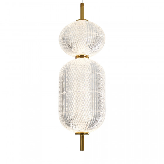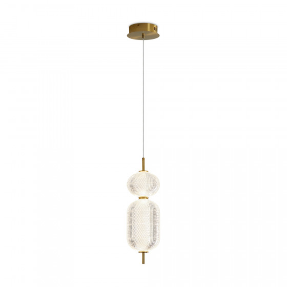 Арматура выполнена из металла в цвете латунь. Прозрачные плафоны. Вертикальные и горизонтальные подвесные светильники разных размеров. LED источник света. Цветовая температура 3000К.