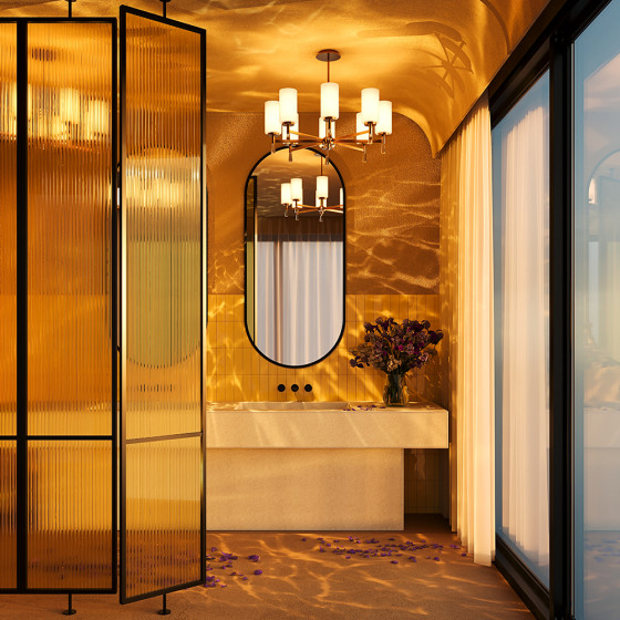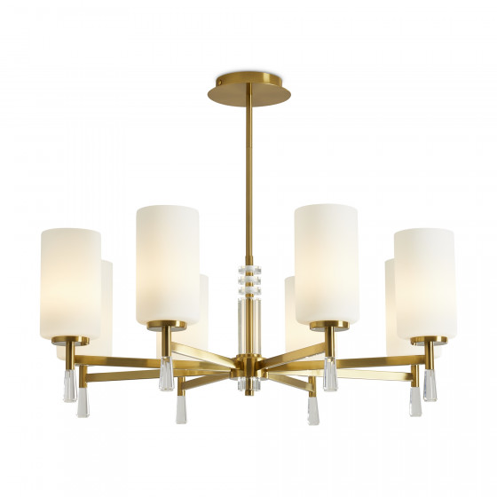 Арматура металл. Цвет латунь. Стеклянные белые плафоны хорошо рассеивают свет, направлены вверх, тем самым вытягивают потолок. Декоративные элементы в виде хрустального основания и капель из акрила. Источник света — лампа. Цоколь E27.