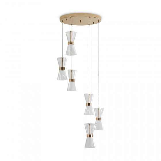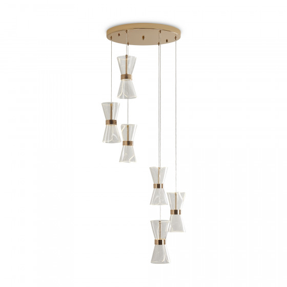 Арматура металл. Цвет золото. Плафоны из акрила. Форма песочные часы. Золотая окантовка как декоративный элемент. К светильникам прилагается пульт управления. LED источник света. Цветовая температура 2600-6000К.
