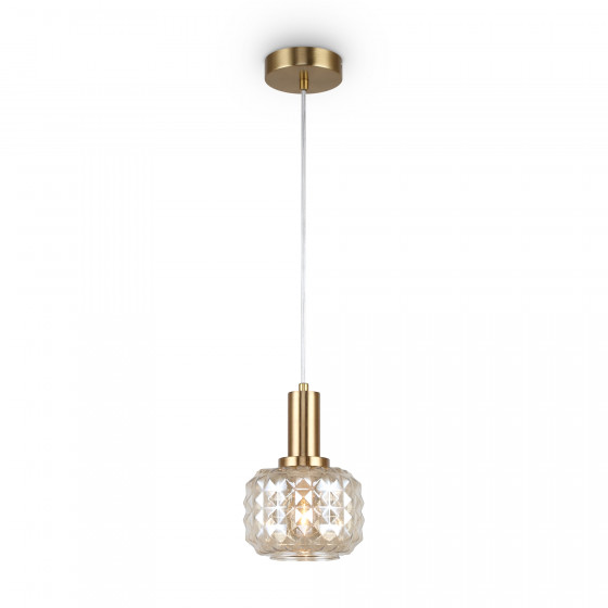 Металлическая арматура в цвете латунь. Плафоны из толстого рельефного стекла в оттенке амбра с «шипованной» огранкой. Подвесные модели регулируется по высоте. Источник света - лампа с цоколем Е14