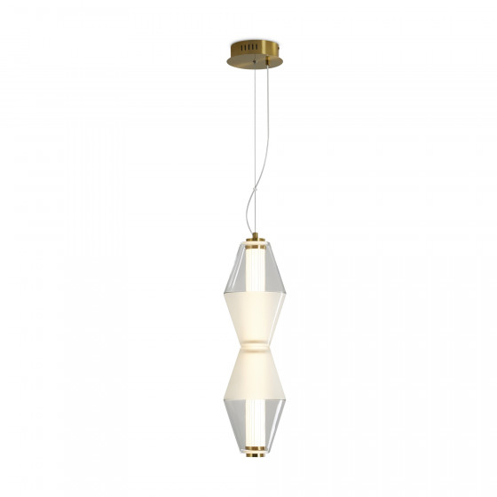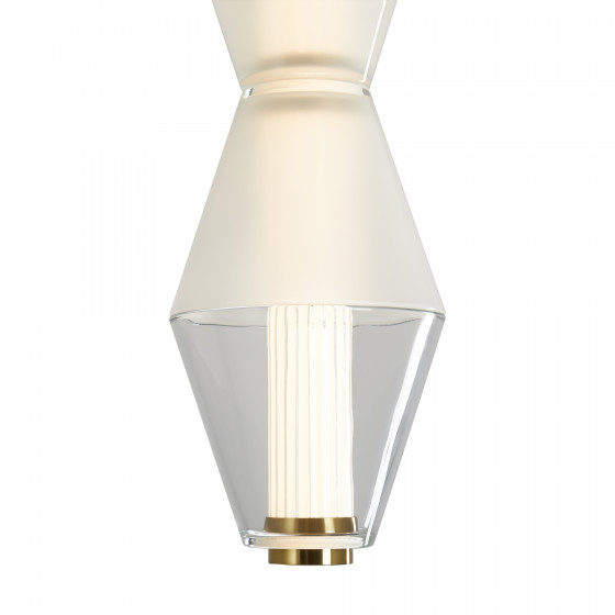 Арматура из металла. Цвет латунь. Плафон из матового, кристально прозрачного и дымчатого стекла. Горизонтальные и вертикальные подвесы. LED источник света. Цветовая температура 3000К.