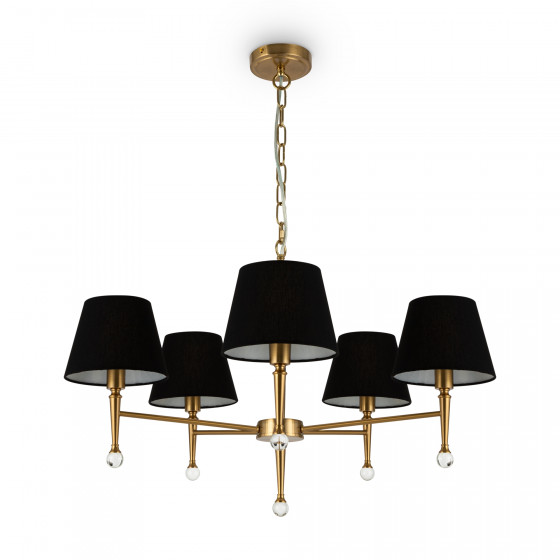 Арматура из металла. Цвет – латунь. Абажуры – текстурированная ткань. Оттенки – белый и черный. Декоративные капли из прозрачного хрусталя. Широкий ассортимент для разнообразных световых сценариев. Торшер с цоколем Е27, лампа, бра и люстры – Е14.