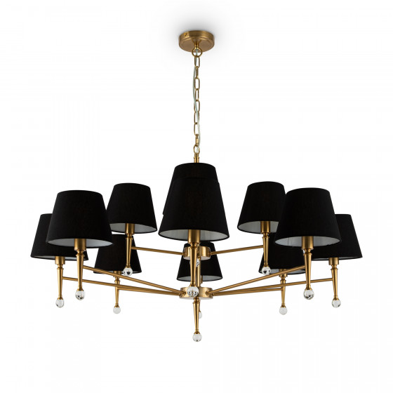 Арматура из металла. Цвет – латунь. Абажуры – текстурированная ткань. Оттенки – белый и черный. Декоративные капли из прозрачного хрусталя. Широкий ассортимент для разнообразных световых сценариев. Торшер с цоколем Е27, лампа, бра и люстры – Е14.